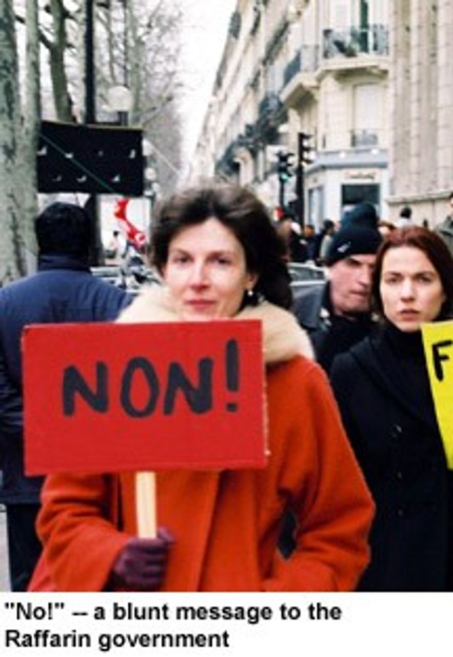 Prime Minister Jean-Pierre Raffarin reacted to the mass demonstrations in a interview the following Monday on the state-controlled radio, France Inter, by commenting, “In a democracy, I’m not contemptuous of demonstrations, but I ask the trade union leaders not to hold parliament in contempt either.... I’m not deaf but it’s not because I listen that I should obey,” before adding that the legislation extending the 35-hour week would “follow the prepared timetable” because “that’s what democratic life is.”
