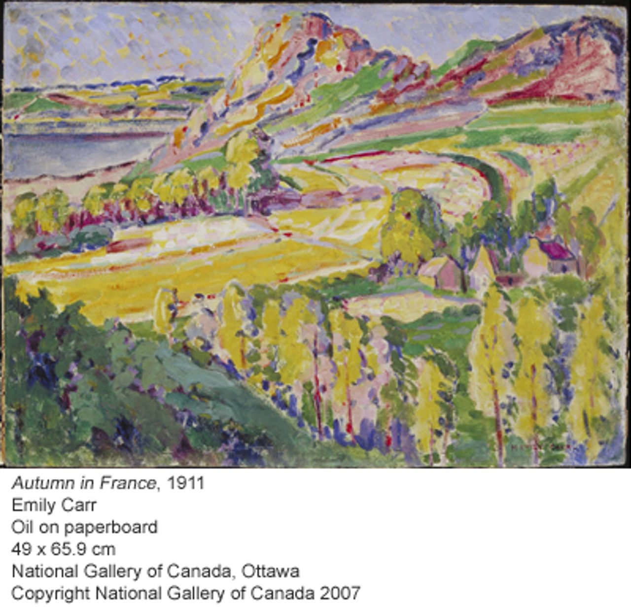 While paintings such as “Autumn in France” (1911) convey Carr’s embrace of the general approach of the impressionists, a piece such as “Trees in France,” done the same year, with its simpler shapes and brilliant yellows, shows the dramatic impact of Fauvism on her work.