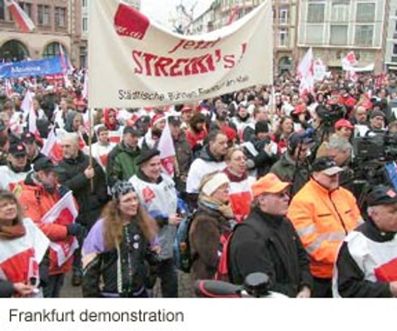 A central demonstration brought 6,000 strikers into Frankfurt city centre. Delegations attended from numerous offices and local institutions intent on voicing their opposition to their low wages and miserable working conditions. Also in attendance were job centre and labour agency personnel.