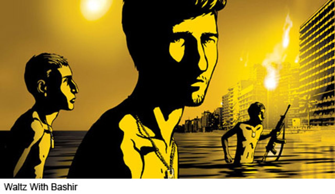 Waltz With Bashir is done with considerable artistry and intelligence. The images are deeply disturbing, hallucinatory, including Folman’s recurring memory of the unclothed soldiers, armed, emerging from the sea in front of a row of Beirut high-rises, under a frighteningly yellow sky.
