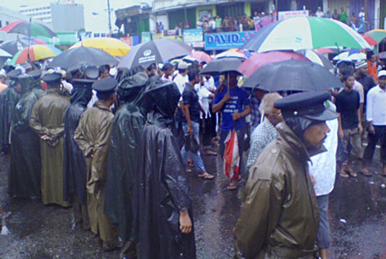 People protested yesterday in heavy rain, chanting slogans against President Mahinda Rajapakse’s government. They displayed posters with slogans such as “Hands off our houses!”, “Our children are on the street”, “Is this Rajapakse’s good governing?” and “The sensitive leader [Rajapakse] is sleeping”. Hundreds of policemen were deployed to contain the protest, and more police were mobilised in the surrounding area.