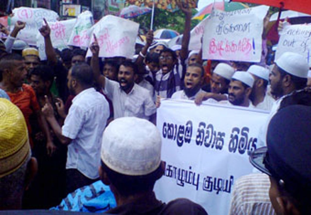 About 200 people held a protest at Slave Island in central Colombo yesterday, opposing the demolition of their houses by the military. Twenty houses where 45 families—mostly Muslim—lived were bulldozed last Friday on the orders of the Defence Ministry.