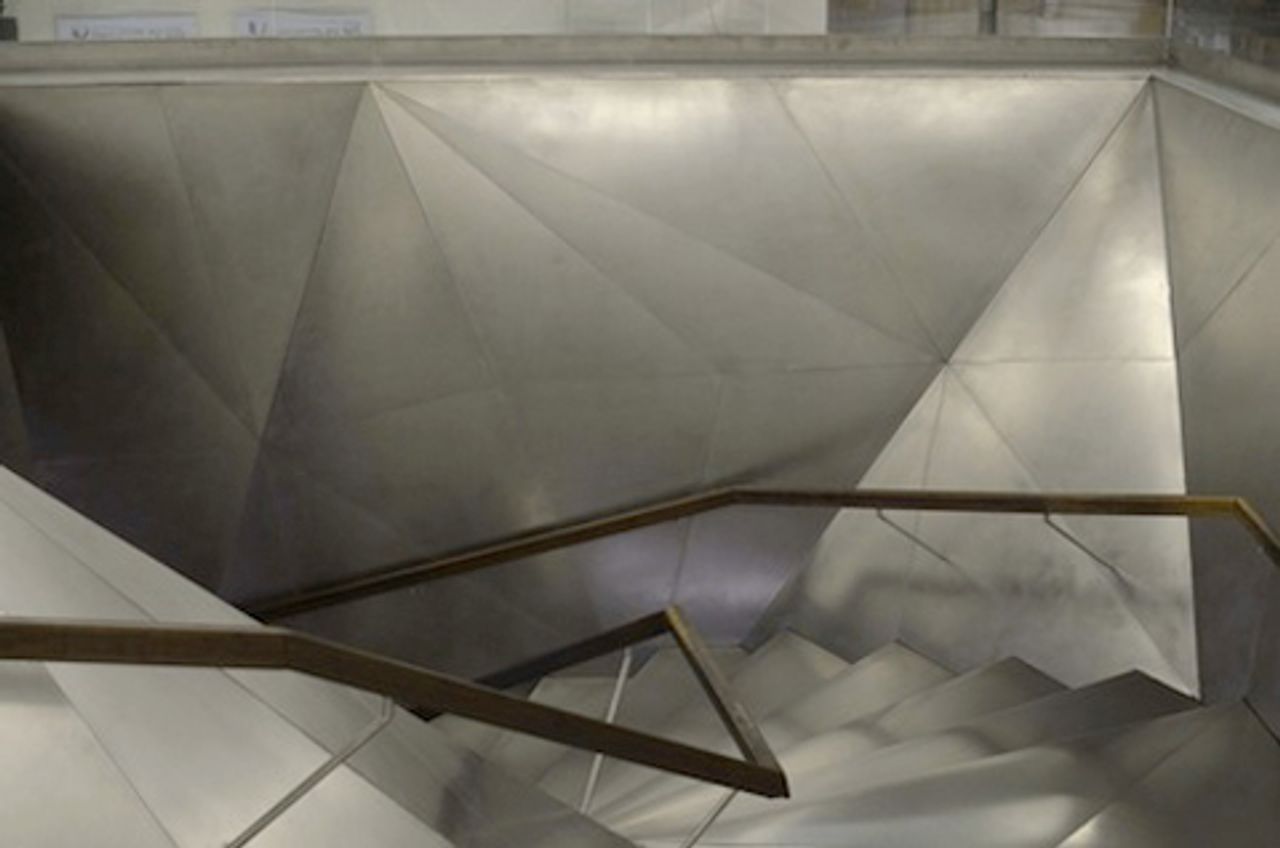 The architects saved the brick face of an old powerhouse, but they replaced the structural system with huge cantilevers and turned a traditional entrance inside out. We passed under a huge mass of the building as if entering a cave before ascending the asymmetrical, stainless-steel stair to the foyer.