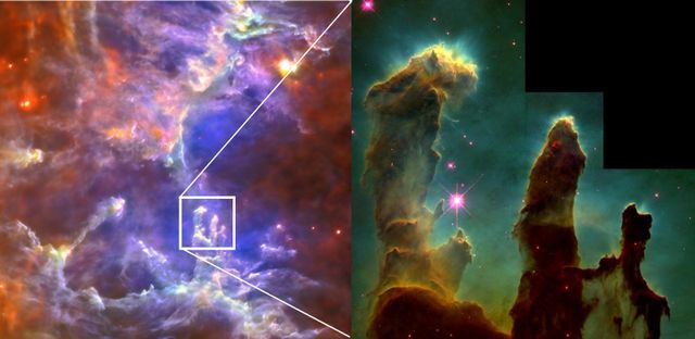 හර්ෂල් නිරීක්ෂනාගාරය අධෝරක්ත මගින් ලබා ගත් ඊගල් නෙබියුලාවේ ඡායාරූපය සහ හබල් දුරේක්ෂය දෘශ්‍ය ආලෝකයේ ගත් ඡායාරූපය. අධෝරක්ත විකිරන වායු වලාකුලු වැනි අදෘශ්‍යමාන ප‍්‍රදේශ විනිවිද යන්නේ කෙසේ ද යන්න හා ඒවායේ අභ්‍යන්තරික ගති ස්වභාවය අනාවරනය කර ගන්නේ කෙසේ ද යන්නට මෙය එක් නිදසුනකි. හබල් දුරේක්ෂය දැක ඇති ආකාරයේ පාරාන්ධ කුලුනුවල සූත‍්‍රිකාවන් හි අභ්‍යන්තර දර්ශන හර්ෂල් ඡායාරූපය විසින් පෙන්නුම් කෙරෙයි.