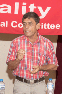 “වතු කම්කරුවන්ගේ රැකියා සහ ජීවන තත්වයන් ට එල්ල කරන ප‍්‍රහාරය ශී‍්‍ර ලංකාවේ සමස්ත කම්කරු පන්තියේ අයිතීන්ට එල්ල කරන ප‍්‍රහාරයේ කොටසක්. එය ගැඹුරුවෙන ලෝක ධනවාදී අර්බුදයේ බර කම්කරු පන්තිය මත පැටවීම පිනිස හැම රටකම ධනපති පාලක පන්තීන් කි‍්‍රයාවට දමන සමාජ ප‍්‍රතිවිප්ලවයේ කොටසක්” බව ඔහු පැවසුවේ ය.