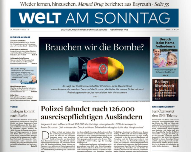 ජර්මනියේ දක්ෂිනාංශික සභාග ආන්ඩුව මිලිටරි වියදම් වල දැවැන්ත ඉහල නැංවීමක් කිරීමට තමන් හට ඇති උත්සුකය ප්‍රකාශයට පත් කොට යන්තම් සතියක් ගෙවුනු තැන, ප්‍රධාන ජාතික පුවත් පතක් න්‍යෂ්ටික ආයුධ ගබඩාවක් තැනීමට කැඳවුම් කර ඇත. ගෙවුනු සති අන්තයේ ප්‍රකාශයට පත් කෙරුනු තම නවතම කලාපයේ වෙල්ට් අම් සොන්ටාග්, මුල් පිටුවේ න්‍යෂ්ටික බෝම්බයක රූපයක් ප්‍රදර්ශනය කලේය. සිරස්තලය වන්නේ මෙයයි: “අපට බෝම්බය අවශ්‍යද” පිලිතුර වන්නේ පැහැදිලි සහ භියජනක “ඔව්!” එකකි.