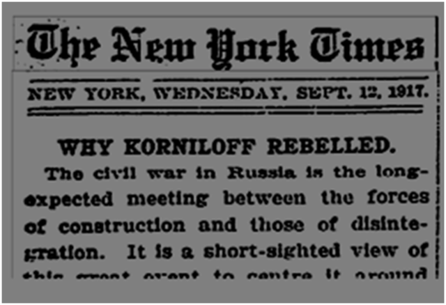 1917 සැප්තැම්බර් 12 නිව්යෝර්ක් ටයිම්ස් පුවත්පත කොර්නිලොව් සම්බන්ධයෙන් සිය අනුමැතිය