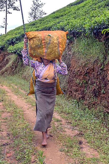 ඇබොට්ස්ලී වත්තේ කම්කරු කාන්තාවක් බර කිරීම සඳහා තේ දලු රැගෙන යයි