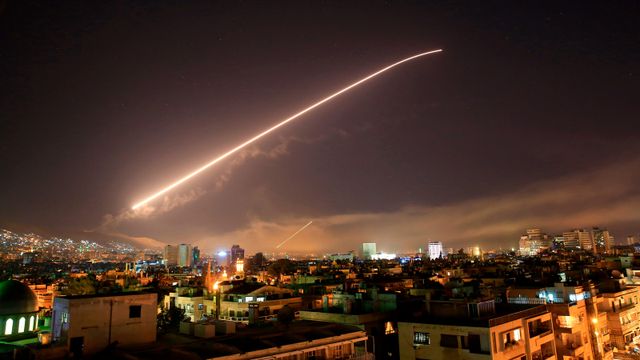 එක්සත් ජනපදය 2018 අප්‍රියෙල් 14 වන දින සිරියාවේ දමස්කස් වෙත ප්‍රහාරයක් දියත් කලේය. එක්සත් ජනපද ජනාධිපති ඩොනල්ඩ් ට්‍රම්ප් විසින් රට තුල රසායනික අවි භාවිතා කල බවට පලිගැනීමක් ලෙස ගුවන් ප්‍රහාර ප්‍රකාශයට පත් කරන ලදී. (AP Photo/Hassan Ammar)