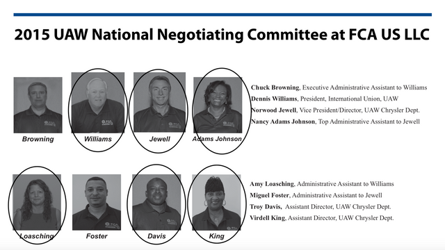 ෆියට් ක්‍රයිස්ලර් කම්කරුවන්ට වැටුප් හා ප්‍රතිලාභ ඩොලර් දහස් ගනනක් අහිමි කල 2015 ගිවිසුමට අත්සන් තැබූ ඉහල යූඒඩබ්ලිව් “සාකච්ඡාකරුවන්” අට දෙනාගෙන් අවම වශයෙන් හය දෙනෙකු දූෂන සෝලීන්වලට වරදකරුවන් කෙරිනි නැතහොත් සම්බන්ධ කෙරිනි.