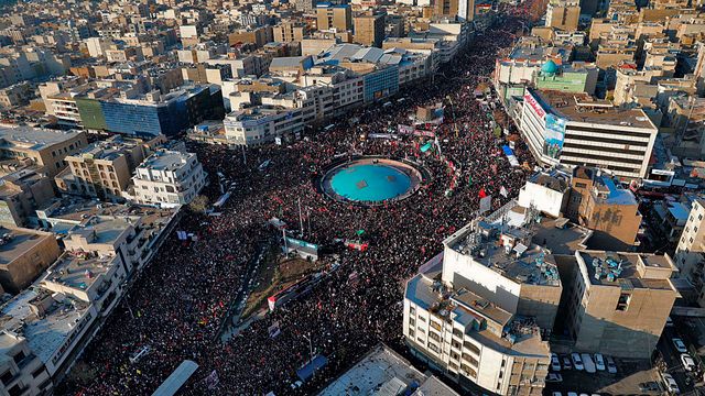 ජනවාරි 3දා එක්සත් ජනපද ඩ්‍රෝන් ප්‍රහාරයකින් ඝාතනය කරන ලද ජනරාල් කසීම් සුලෙයිමානි හා ඔහුගේ සහෝදර නිලධාරීන්ගේ අවමංගල උත්සවයට සහභාගි ව හඬාවැටෙන්නන්, 2020 ජනවාරි 6 සඳුදා. (ඒපී පුවත්, ඉරාන ශ්‍රේෂ්ඨ නායකයාගේ කාර්යාලය)