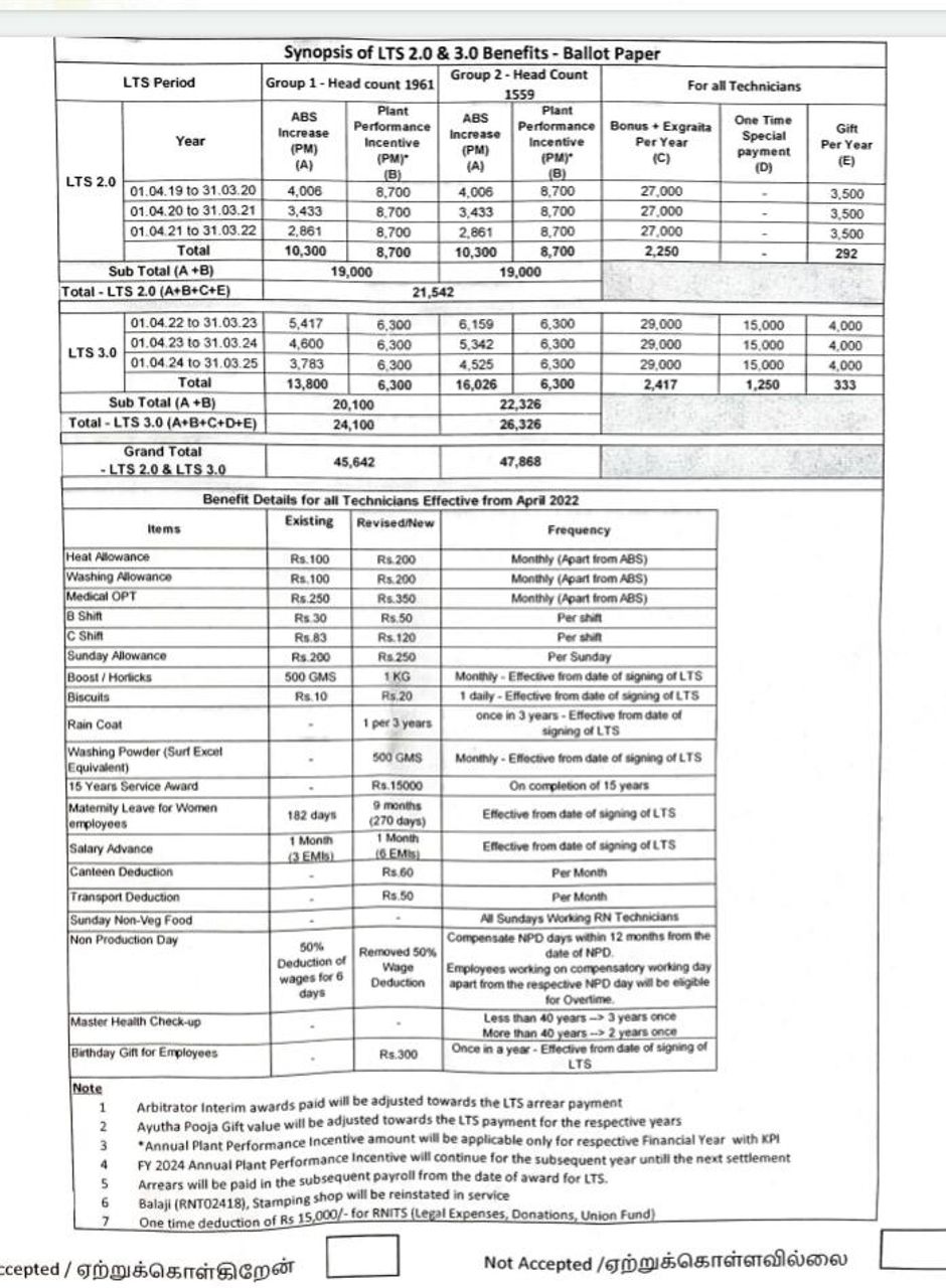 நிர்வாகத்துடன் நெருக்கமாக செல்பட்டு வரும்  RNITS மற்றும் ULF, தொழிலாளர்கள் மீது பாதகமாக பாய்ந்தன. 31 மார்ச் 2018 அன்று காலாவதியான ஒப்பந்தத்தின் வாரிசு ஒப்பந்தம் குறித்த பேச்சுவார்த்தைகளின் நிலை குறித்து, பல ஆண்டுகளாக தொழிலாளர்கள் இருட்டில் வைக்கப்பட்டனர். அதன்பின் டிசம்பர் மாத இறுதியில், எந்தவித முன்னறிவிப்பும் இன்றி, ஆலையை ஒரு வாரத்திற்கும் மேலாக  தற்காலிகமாக மூடுவதற்கு சற்று முன், தொழிற்சங்கம் இரண்டு அடுத்தடுத்த, மூன்று ஆண்டு கால ஒப்பந்தங்களுக்கு பேச்சுவார்த்தை நடத்தியதாக அறிவித்ததுடன் உடனடியாக 'ஒப்புதல்' வாக்கெடுப்புக்கு சென்றது.